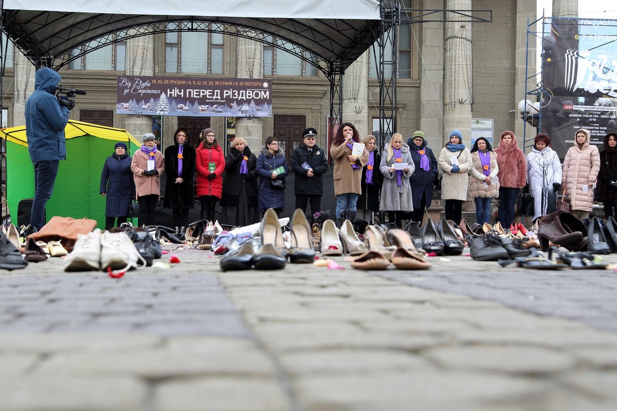 Взуттєву інсталяцію в Тернополі організували у рамках загальнонаціональної акції «16 днів проти насильства». Вона стартувала на Тернопільщині 25 листопада, а триватиме до 10 грудня. Упродовж цих днів проводять різноманітні заходи, аби привернути увагу суспільства до проблем насильства в сім’ї, торгівлі людьми, захисту прав жінок та дітей.