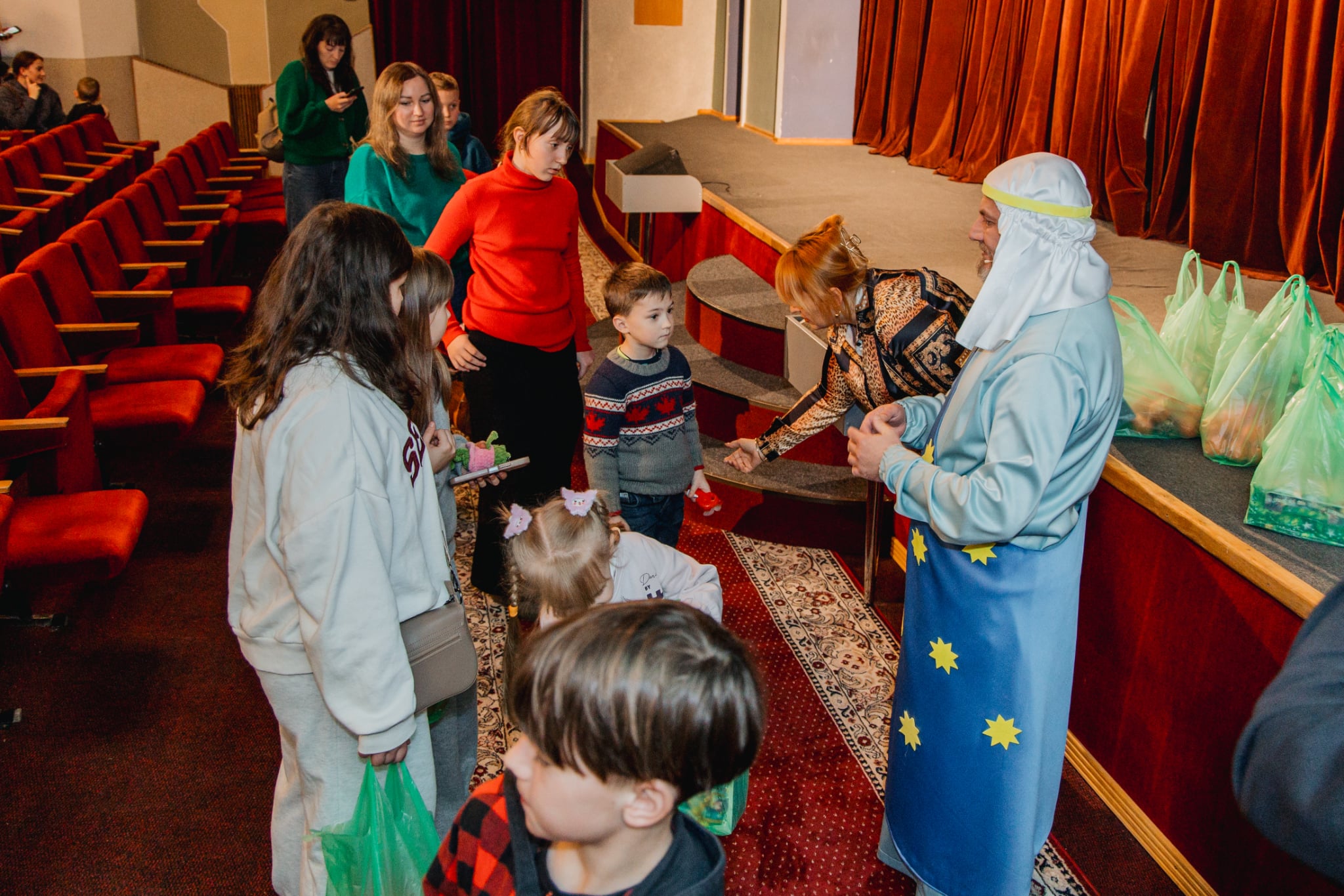 Для юних гостей актори театру представили виставу «Від серця до серця». За словами організаторів, саме ця історія була обрана через її світлий, доброзичливий характер та акцент на підтримці й взаємоповазі. Протягом показу діти активно реагували на персонажів і з цікавістю стежили за сюжетом.