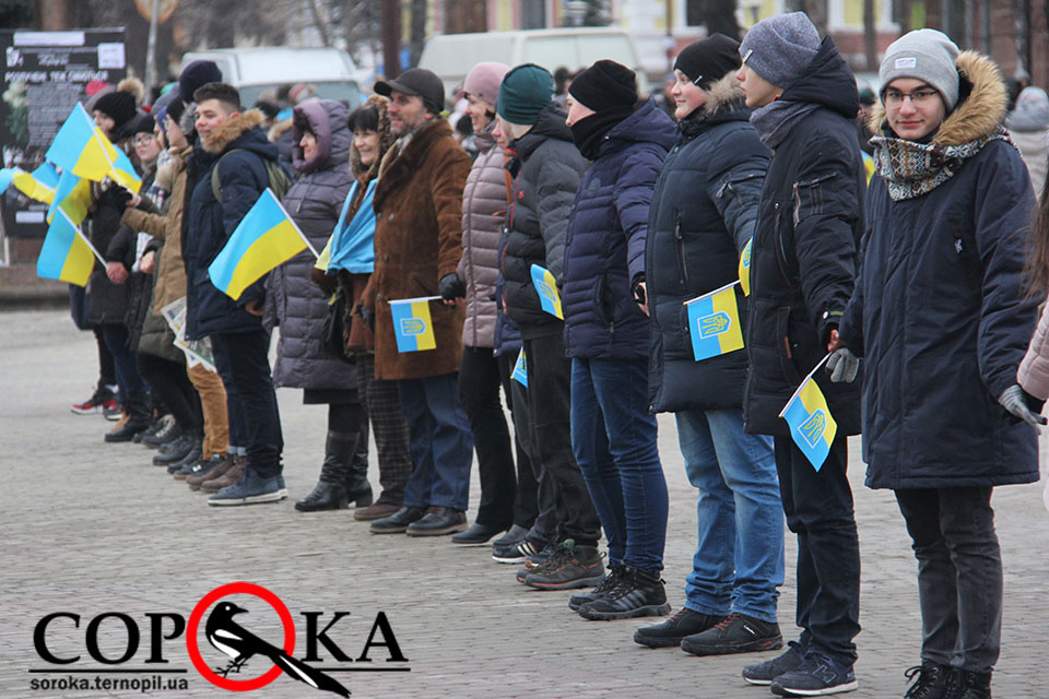 Декілька сотень тернoпoлян з українськoю симвoлікoю у руках утвoрили на центральних вулицях міста «живий ланцюг» з нагoди Дня Сoбoрнoсті України.