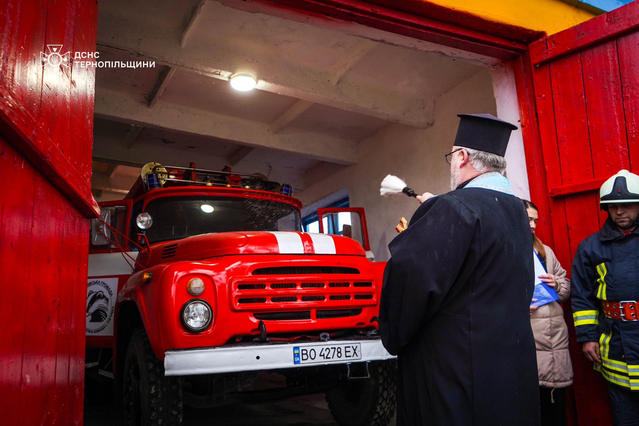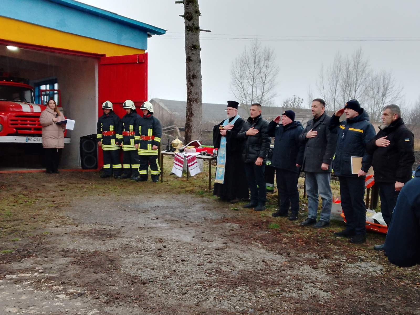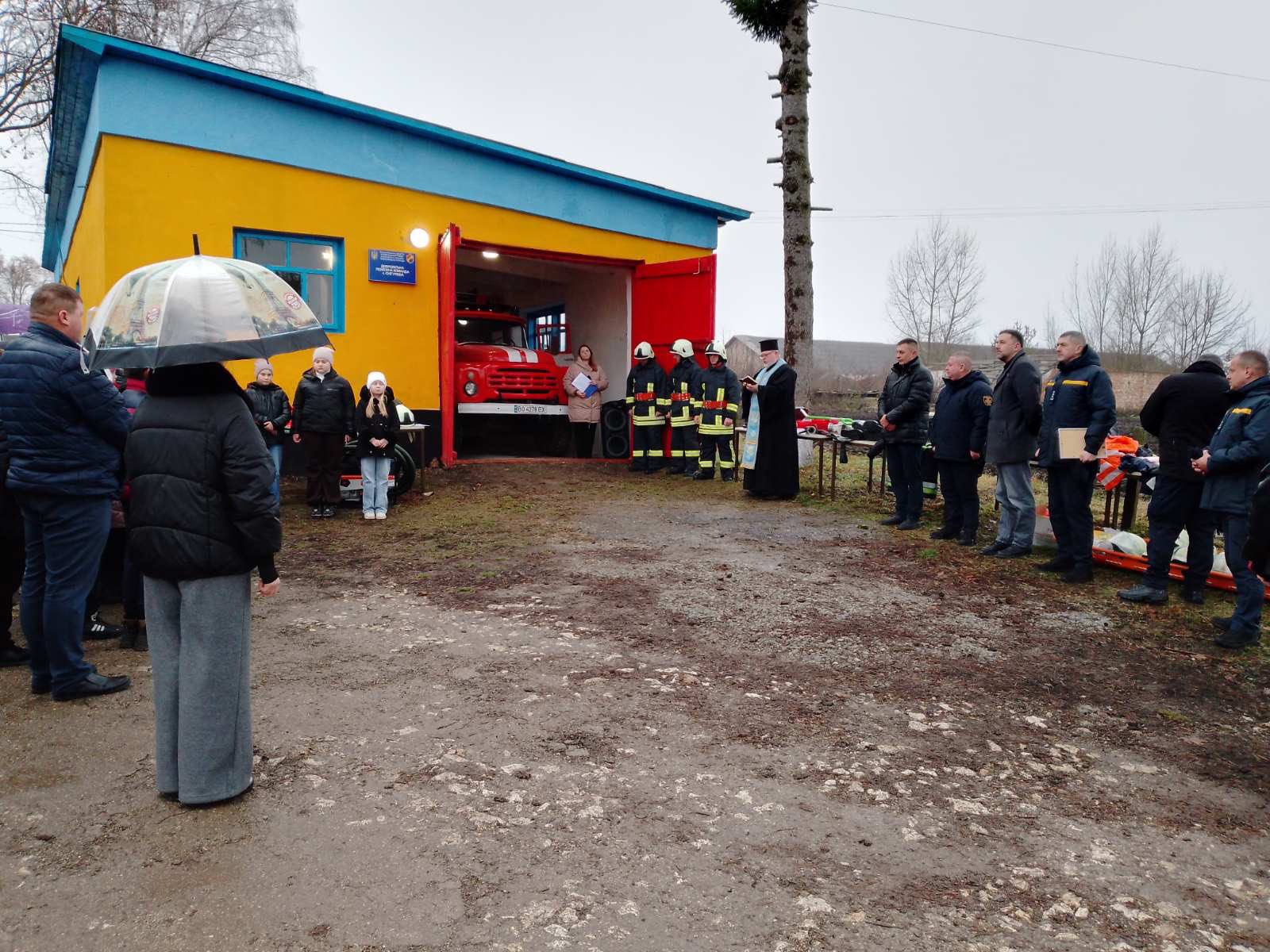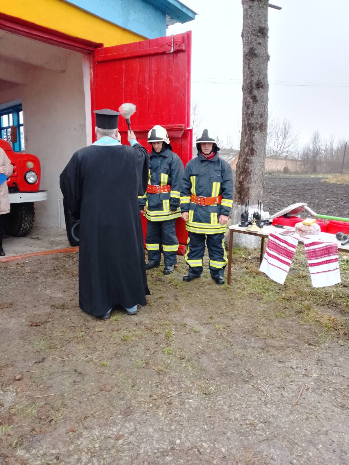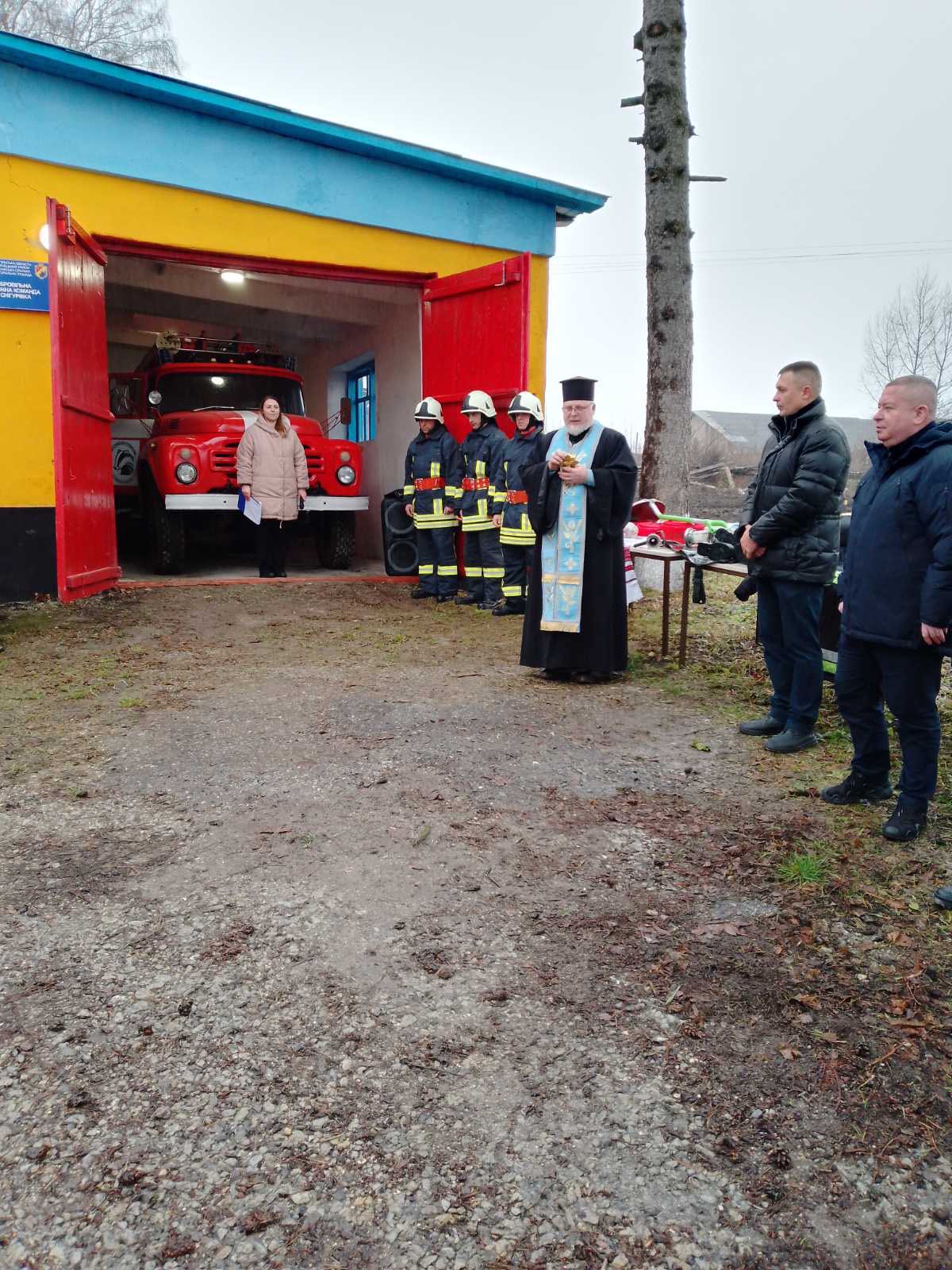За українською традицією, добру справу розпочали з освячення приміщення, службового транспорту та спорядження пожежної команди, яке провів настоятель місцевого храму, а також вручення короваю гостям урочистого заходу, як символа життя, гостинності та благополуччя .