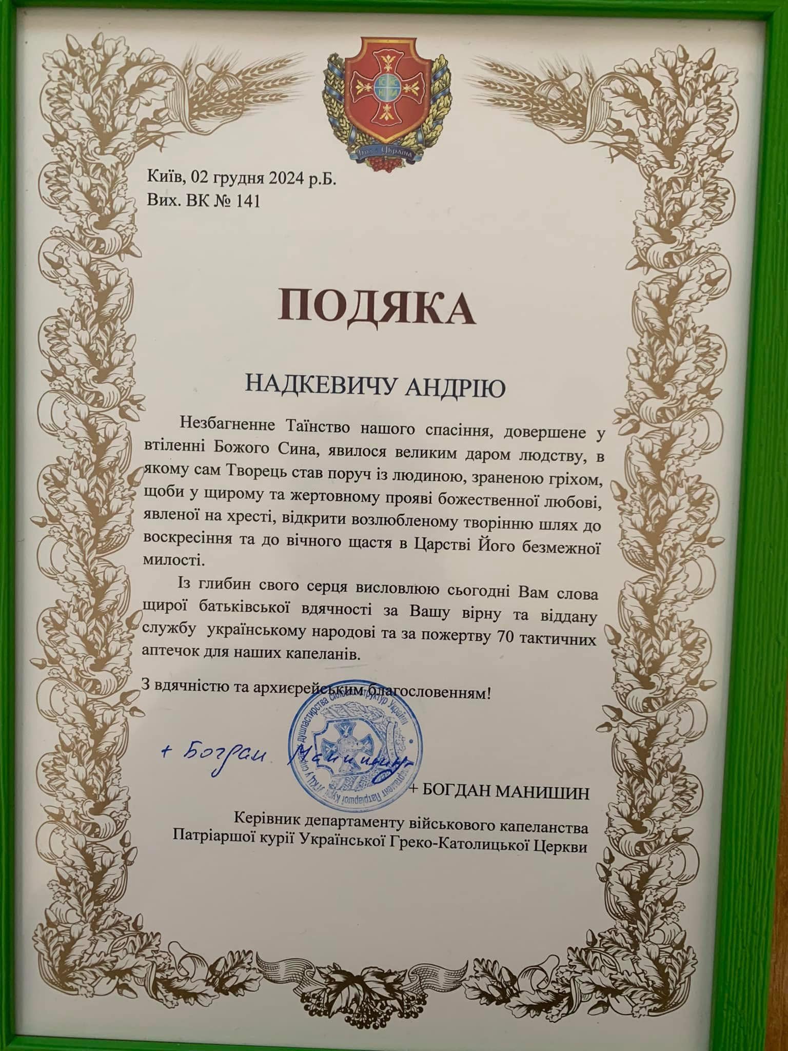 – Із глибини свого серця висловлюю сьогодні вам слова щирої батьківської вдячності за вашу вірну та віддану службу українському народові та за пожертву 70 тактичних аптечок для наших капеланів, – йдеться у тексті подяки.