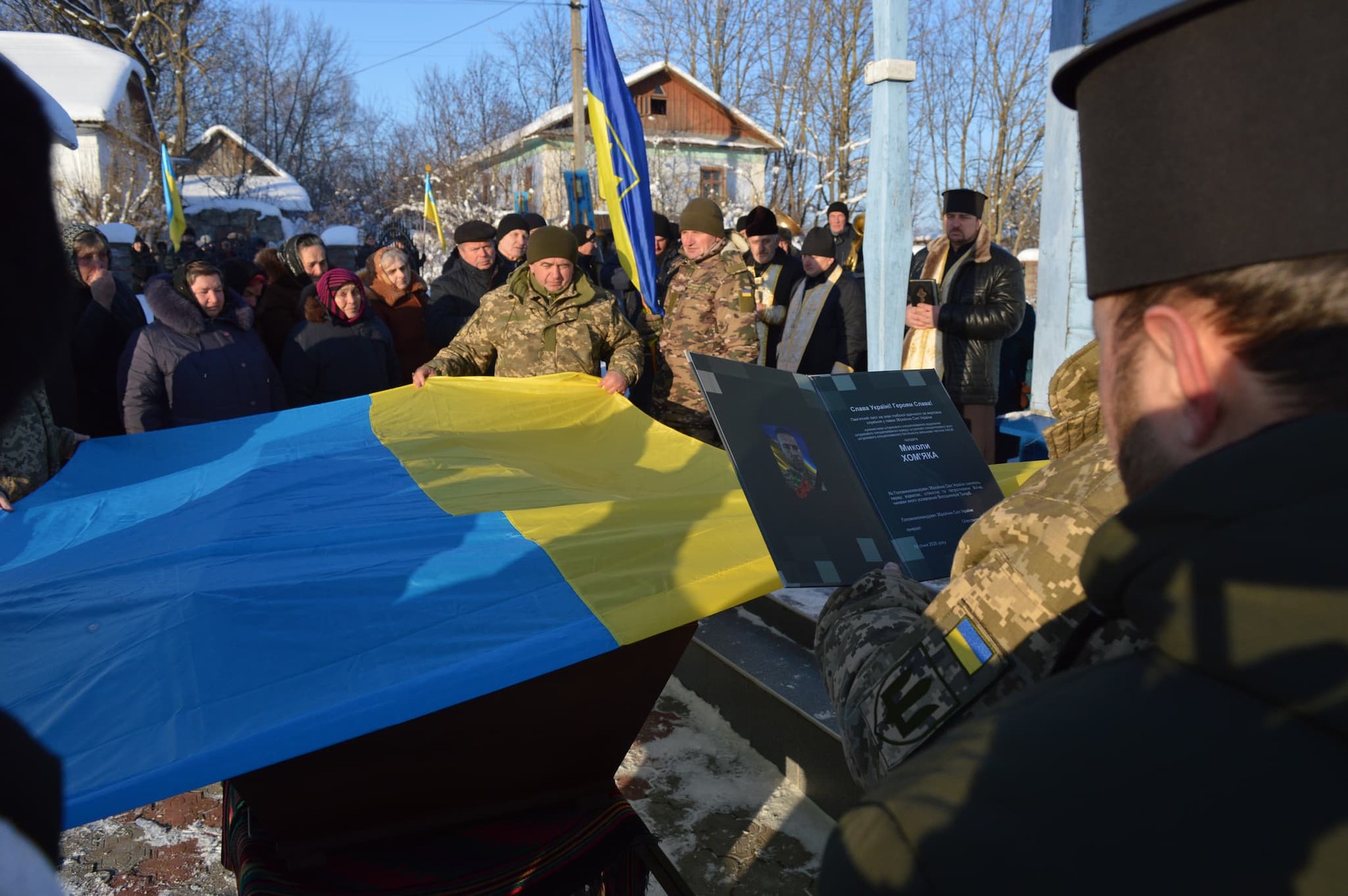 Прощання з Миколою Хом’яком відбулося з усіма військовими почестями. Під звуки Державного гімну України та залпу бабусі полеглого захисника вручили Державний Прапор – символ жертовності, честі та вдячності народу за його подвиг.